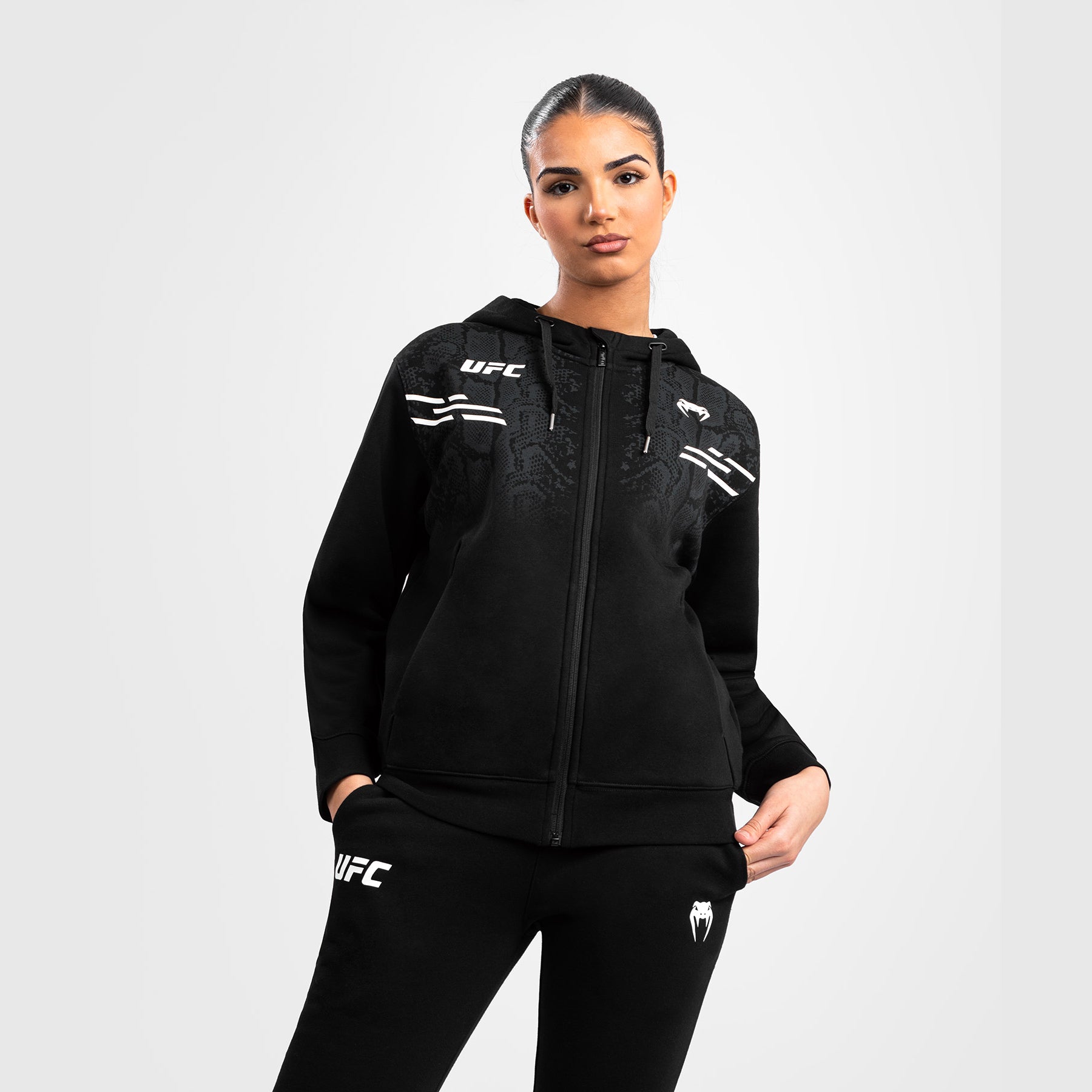 Der UFC Adrenaline by Venum Replica Damen-Kapuzenpullover mit Reißverschluss verfügt über dezente Schlangenhautgrafiken auf den vorderen Schultern und auf der Brust sowie weiße Venum- und UFC-Logodetails.