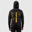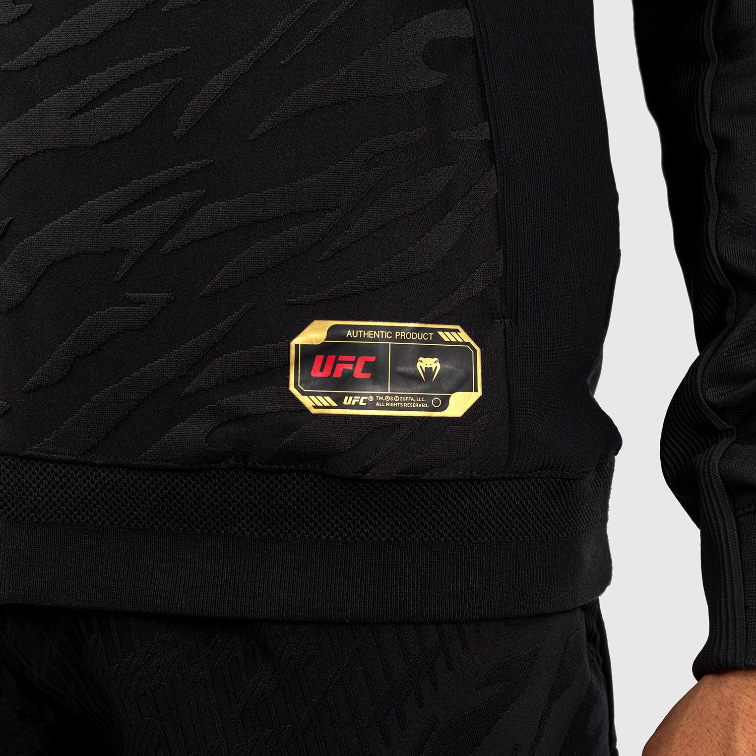 Der UFC Fusion von Venum Authentic Fight Night Herren Walkout Hoodie verfügt über zwei Reißverschlusstaschen sowie eine meshgefütterte Kapuze mit verstellbaren Kordeln. Die Handgelenke und das innere Paneel der Arme bestehen aus einem hochwertigen Stretchstoff, der es den Athleten ermöglicht, ihre Hoodies auszuziehen, ohne ihre Handschuhe abzunehmen. Diese Schwarz/Gold-Farbkombination ist den UFC-Meistern vorbehalten.