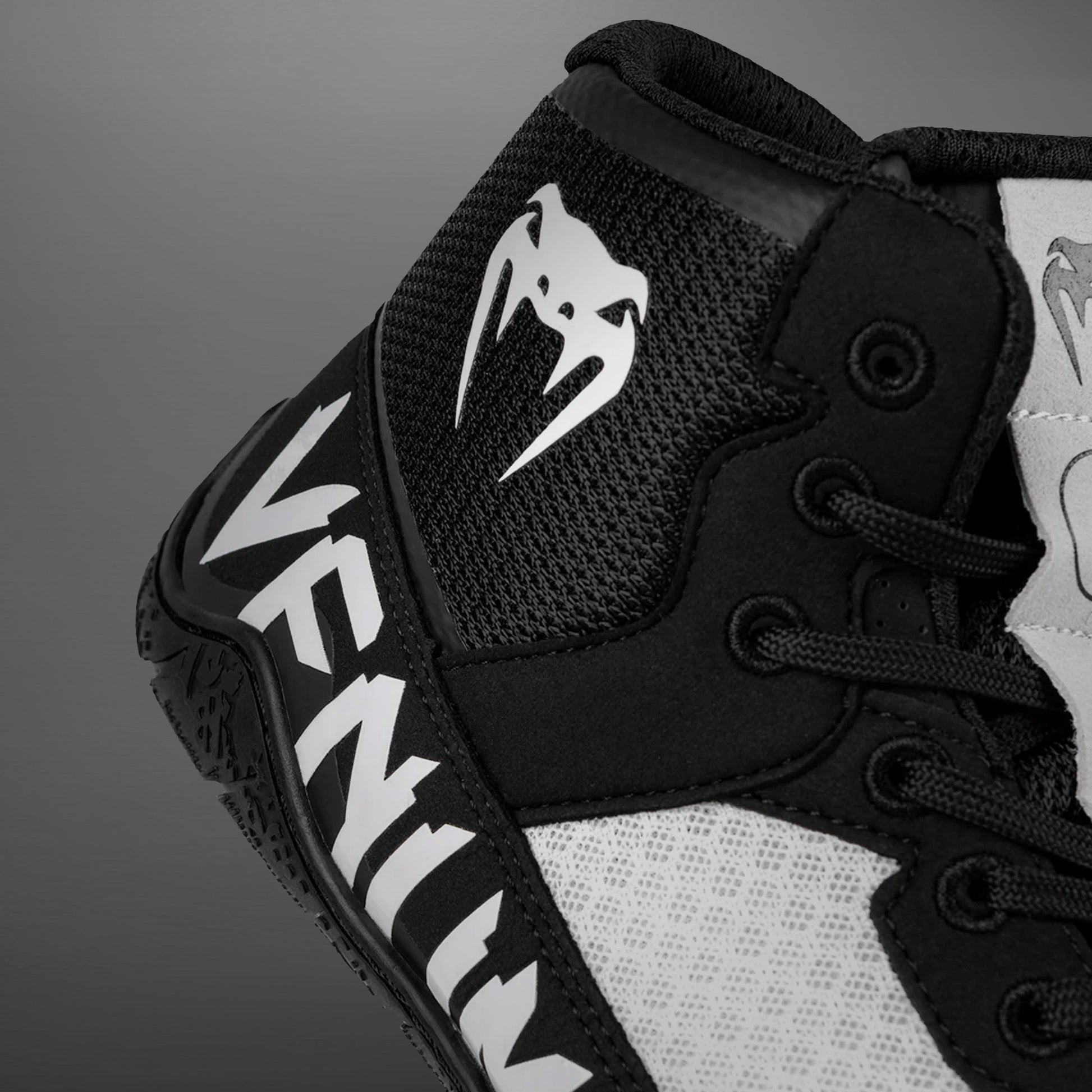 Bring deine Performance auf das nächste Level in dieser raffinierten schwarz/weißen Farbgebung mit tonalen Venum-Logos an der Seite und auf der Zunge.