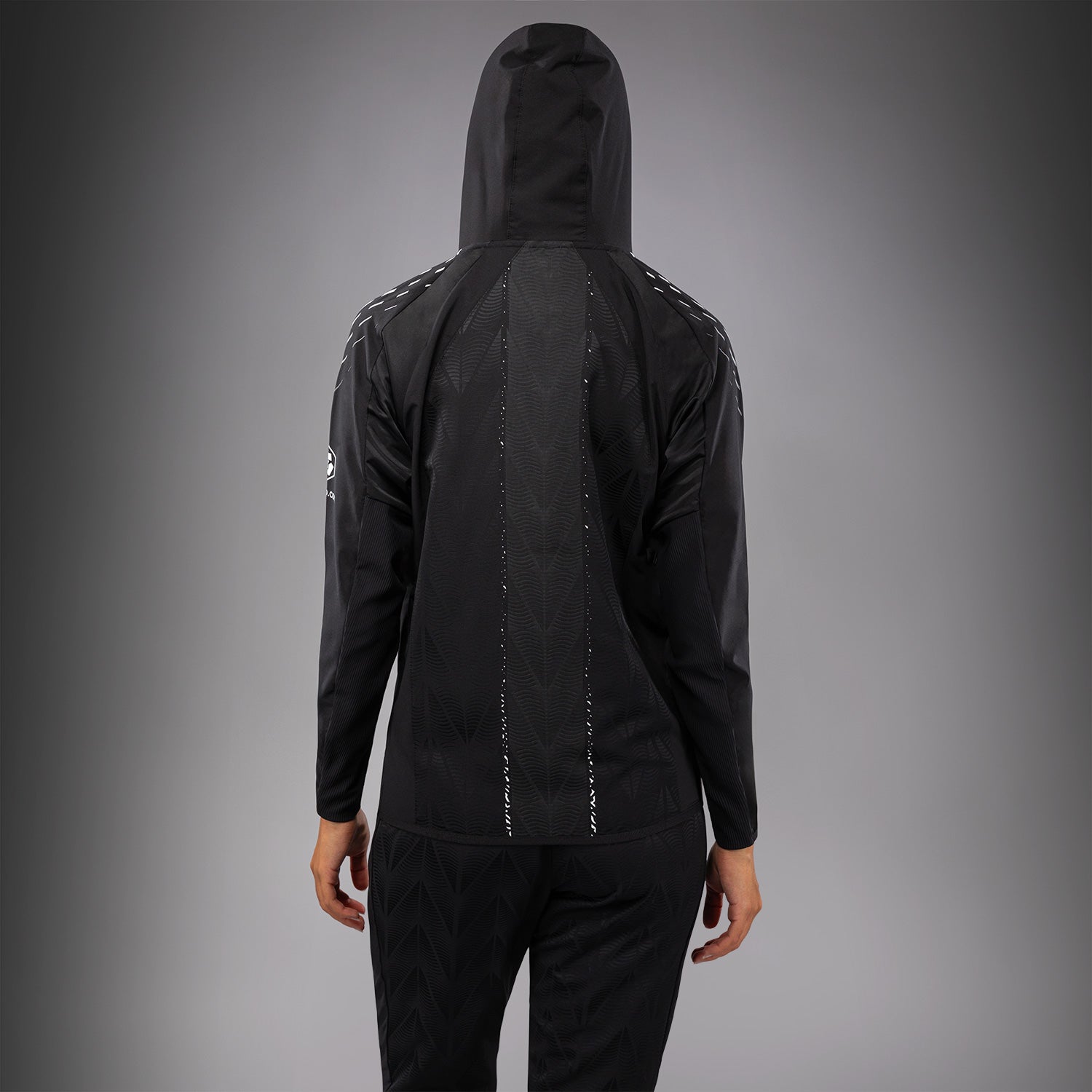 Der Hoodie verfügt über zwei Reißverschlusstaschen und eine kapuzeninnenseitig mit Mesh gefütterte Kapuze mit verstellbaren Kordeln. Bündchen und Innenpartien an den Armen bestehen aus elastischem Rippstrick, damit Athletinnen den Hoodie auch mit Handschuhen mühelos ausziehen können. Ein eingestricktes Motiv auf Brust und Rücken sorgt für eine edle Optik.